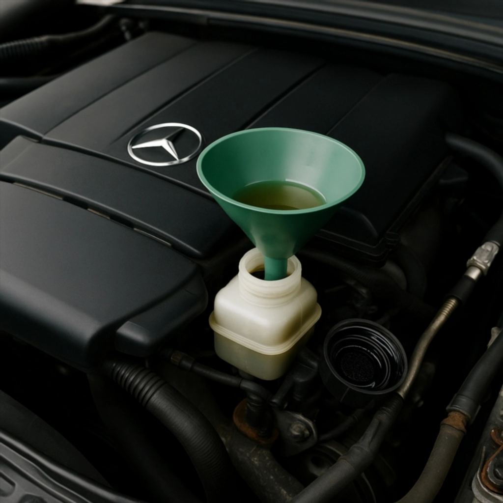 Завод-изготовитель Mercedes-Benz предписывает использовать специализированную жидкость, соответствующую техническому стандарту MB 345.0 или MB 236.3 (в зависимости от года выпуска). Эти спецификации описывают параметры гидравлических жидкостей, подходящих для систем рулевого управления и гидроподвески.